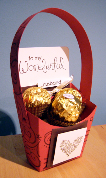 I started with the Thank you box template from teh Demonstrator Website, and added a long elegant handle, securing onto the box with red love heart brads. The Card i have used is a Ruby Red Base, with Chocolate Chip and Very Vanilla Accents.