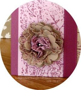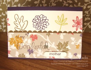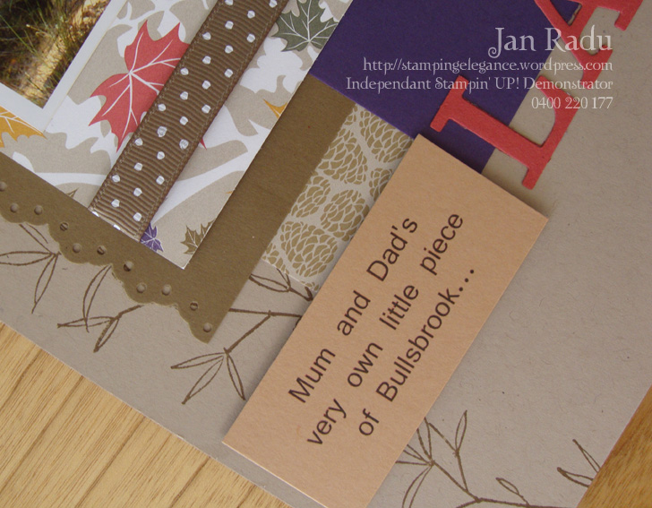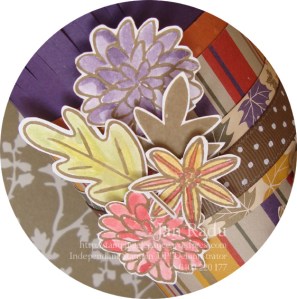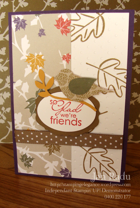 Autumn Harvest DSP, Soft Suede and Eggplant Card with other Earth Elements Colours, Ink – Chocolate Chip, Soft Suede, Elegant Eggplant, Ruby Red, Old Olive, Kiwi Kiss, Summer Sun, Pumpkin Pie (Watercoloured Images), Stampsets- Embrace Life, Autumn Flair Hostess Sets, Wonderful Favourites, Big Shot – Polkadot Embossing Folder, Buttons Sizzlit, Timeless Junior Alphabet, Ribbon and Embellishments – Soft Suede Polkadot Grosgrain, Linen Thread