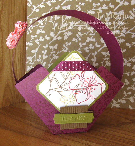 This is not a printable template – just an indication for measurements and cut lines. One you have scored your grid and cut along the 4 cutlines, you can fold it all the way up for a square box, or fold it to your desired angle and secure with a staple for an angled favour box like I have made. A great tip for quick results with the least “fuss” is to angle the sides and place your handle on the inside – securing all with one staple per side – yes just one staple holds each side and the handle together.
