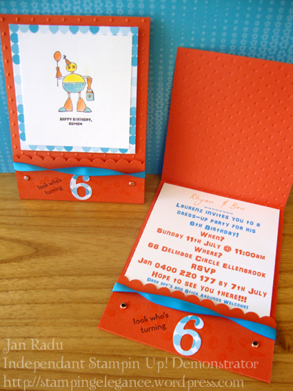 My big boy is turning 6 in a few weeks and it is the first real opportunity I have had to go all out Stampin’ UP! style for party invites… So here is my creation!