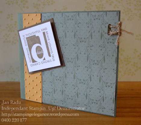 My base card is Always Artichoke, with DSP from Autumn Traditions and an embossed strip of More Mustard Card stock using my Bigshot and Polkadot Embossing folder. I’ve inked my stamp with Soft Suede and matted with same. My little punched slot is tied off with Jute String (I’ve run out of my favourite Hemp Twine for the moment!)