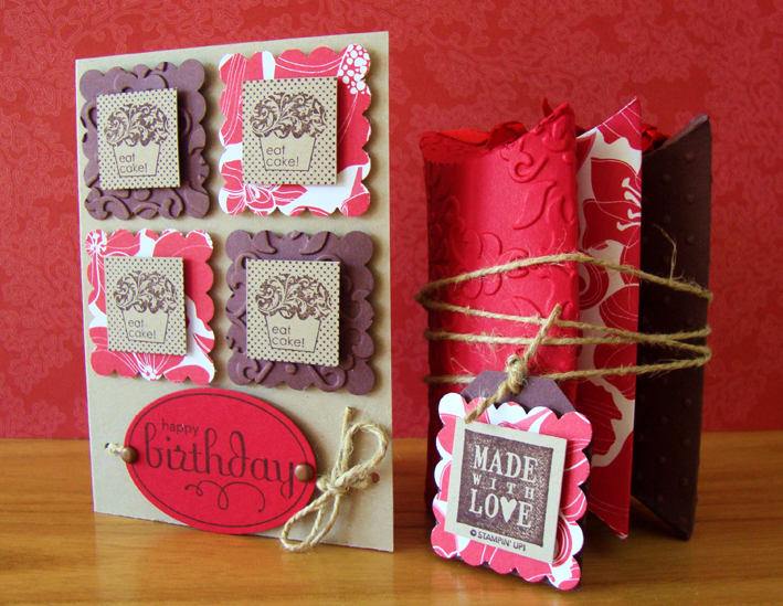 I’ve used Kraft card stock as my base (Did you know that in the new catalogue this is continuing as a core colour with a name change “Crumb Cake”?). The Real Red DSP I’ve used is from the Pink Flamingo range (on special now on the Last Chance List at an amazingly low price of $8.48!).