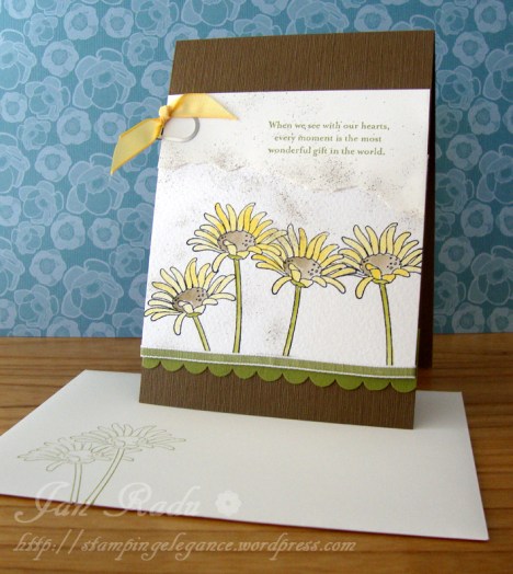 I am a convert to this set! We used the masking technique to add some dimension to the row of daisies, and then watercoloured using our Aqua Painter and Daffodil Delight, Soft Suede and Old Olive ink, The ribbon is Daffodil Delight and Pear Pizazz. We added some tearing and colour spritzing just to finish it off. Isn’t it beautiful?