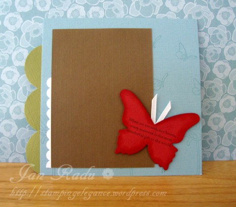 Isn’t this just simple and sweet? The real red butterfly is one of the new dies available for your bigshot in the new catalogue. Isn’t the background stamping sublte but effectiveSo are you won over now with this stamp set? I learn’t a really valuable lesson to not judge a book by its “uncoloured” cover as the images in “Every Moment” truly came to life with a little Classic Ink and my Aqua Painter.