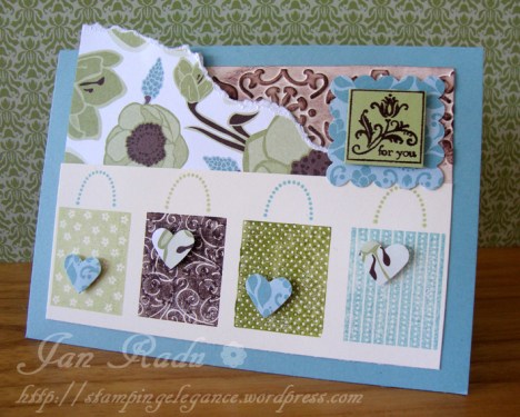 Did I mention that the delicious DSP I have used in all of these projects is from Greenhouse Gala? My adorable little gift bags have been stamped using the Hostess Level 3 Playful Pieces – I just lined the four rectangle stamps up on my large acrylic block, inked each up with a different stampin’ write marker and stamp all at once – cute eh? I added the handles with my stamp-a-majig to make sure it all lined up and then added a small heart with my punch using scraps of the DSP. My For Your stamp is from the Hostess level 2 Cute by the inch.