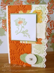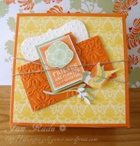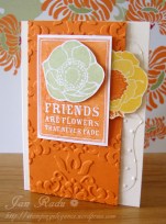 How deliciously summery is this colour combo? Pumpkin Pie the gorgeous new Daffodil Delight and Pear Pizazz. The Very Vanilla highlights just finish it off. The stamp set is Friends Never Fade which is so versatile! I love every single image from the set. I also love combining the embossing folders Perfect polkadots and Vintage Wallpaper – the textures are fantastic!