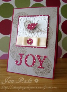 My elegant offering! Cherry Cobbler, Crumb Cake and Very Vanilla. The Medallion from Artistic Etchings is versamarked, crumb caked and clear embossed to make the repeat background. The Two Step Bird punch creates the focal point and in this case the Junior Timeless Alphas and Bigshot create the “Joy” sentiment.