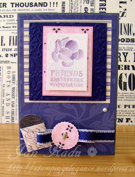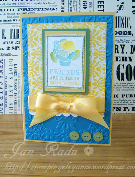 First a sweet friends card with an embossing and water colouring technique I picked up on stampin connection – First I have embossed using White Craft Ink and White Embossing Powder and then water coloured with my aqua painters: