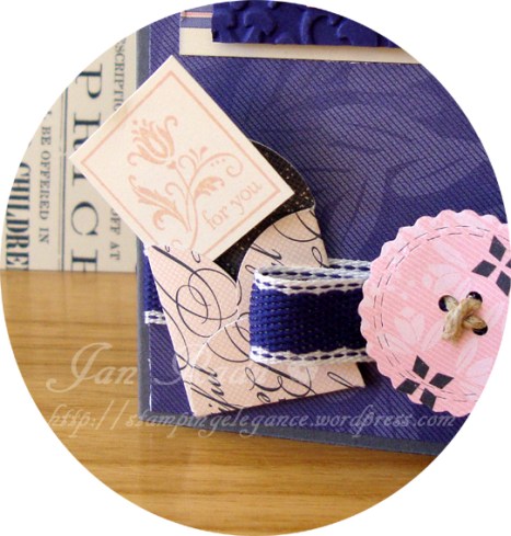 I first punched the Lap of Luxury DSP with my XL Petal Card Punch. Then folded in three sides to create a little envelope. I then chose a sentiment from the Cute By the Inch Level 2 Hostess set and created a little “inchy” note to tuck inside the envelope – such a cute idea!