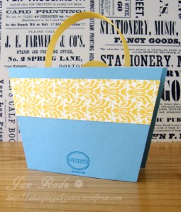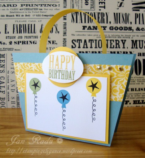 The bag design is an oldie but a goodie, and here you can see I have teamed Baja breeze cardstock with Marina Mist Ink. Oh yes and a dash of Pear Pizazz! My balloons are created by playing around with the stamps in the Level 3 hostess set Playful Pieces. My stamp-a-majig was an absolute must-use here line the balloon pieces up exactly. The sentiment is stamped by inking a portion of the Happy Birthday stamp in level 2 set Afterthoughts