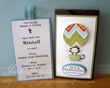 The inspiration for the shape of my invites came from my good friend Trish who used a similar envelope format for her boy Rhyan’s birthday in July. I’ve used two stampsets for these invites; Afterthoughts (hostess level 1) and A Little Treat for the hot air balloon.  I cased the idea of the little monkey in the balloon from a fellow demonstrator on Stampin Connection. My colour inspiration came directly from the DSP Greenhouse Gala (punched here as the balloon).