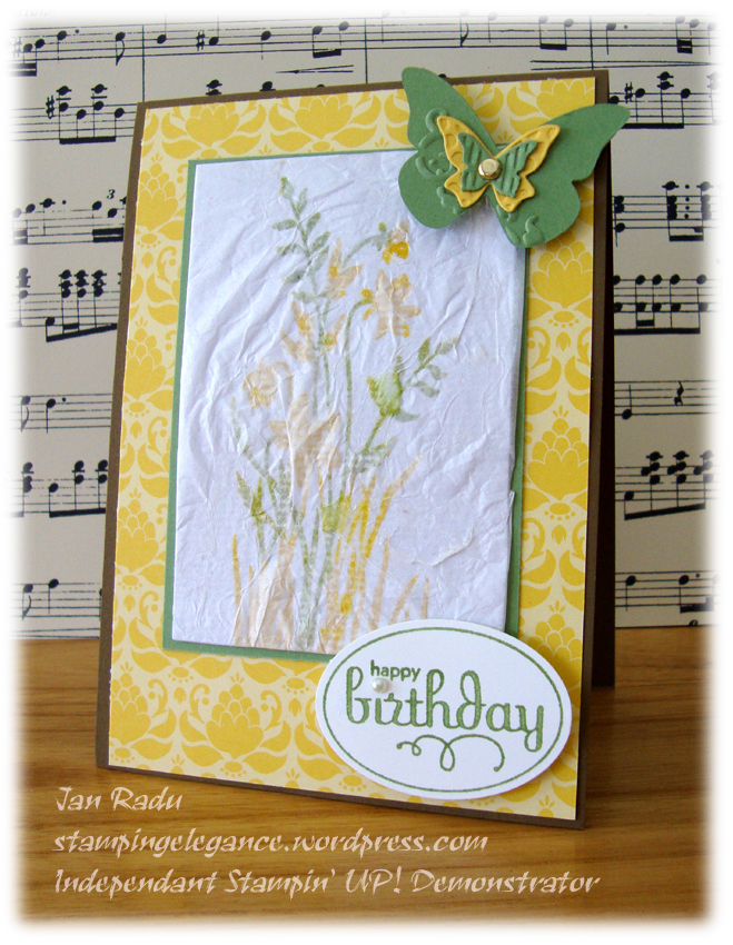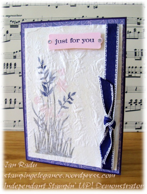 In our Monthly SU Newsletter called Impressions, the technique of Faux Silk was featured and it is such a simple but highly effective technique that I couldn’t wait to demonstrate it at Stamp Club on Friday Night.  Here is the card I demonstrated: