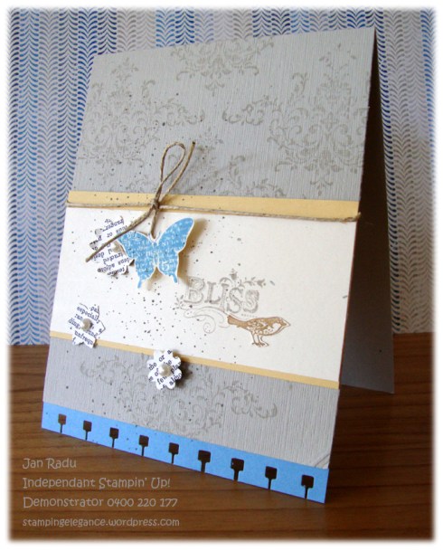 The FREE sale-a-bration stampset Bliss is responsible for this creation – I started with Sahara Sand textured card for the base, and used highlights of Marina Mist and So Saffron with Confetti Cream. I’ve stamped the large background image using Crumb Cake Ink, and added a soft suede bird and Marina Mist Butterfly. My Boho Blossoms are punched from Newsprint DSP – and pearls accent the middle of each. I’ve colour spritzed over everything with my soft suede marker and colour spritzer tool – LOVE IT! I’ve finally tied hemp twine into a bow to finish it all off. Oh and there is my new Spiral Border Punch again!