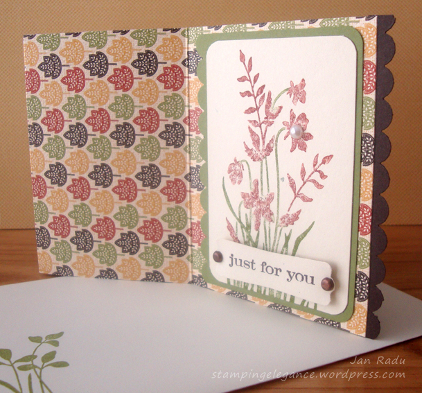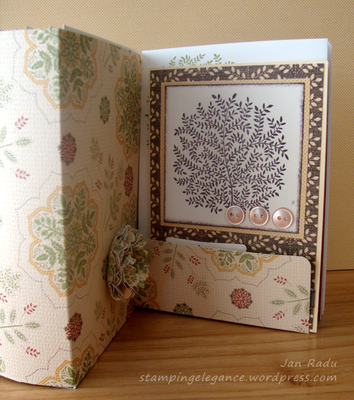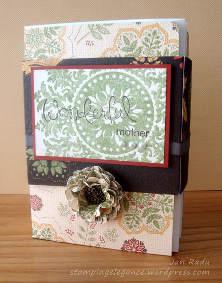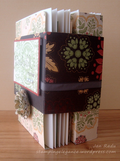 Anyone who knows me, knows how much I Love My Mum 🙂 I worked long and hard on a special gift for her on Mother’s Day. I adapted my Mini Card Folder to hold a standard 15 x 10.5 card and envelope – 10 0f them in fact. The strength of this project is definitely the Autumn Spice Card Stock Weight DSP featured in the new Autumn Winter Mini Catty from Stampinup… the colours are SO my Mum!