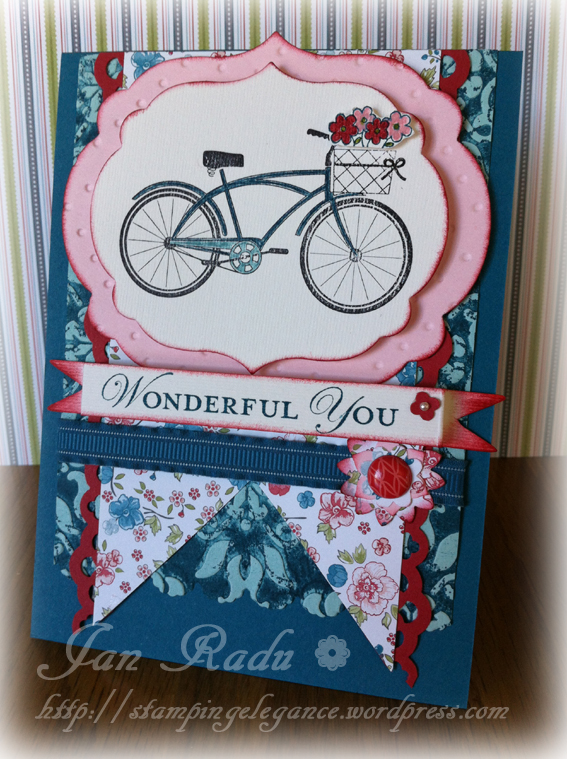 I based my layout on a card I admired over at Delys Cram’s blog here using the banner from the Petal Cone Die for my sentiment and of course the new Framelits dies for the focul point of the bicycle and it’s pirouhette pink mat.