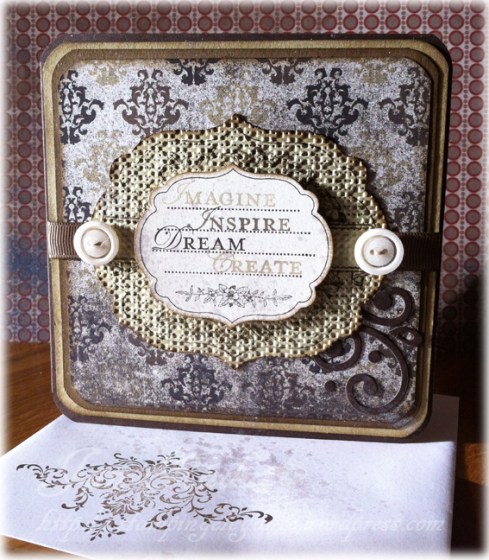 The corners are rounded, and I have recently re-discovered shimmer mist, so I have misted generously over the entire card once finished 🙂 I’ve used the Square Lattice Embossing Folder on the larger framelit after stamping it. My stamp on the envelope is from the retired SAB set Bliss from last year.