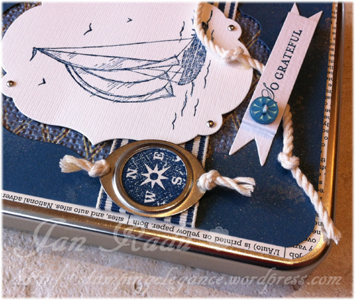 I’ve used Not Quite Navy, Very Vanilla and Newsprint DSP along with Well Worn DSP – And liberal amounts of shimmer mist!!! My Sailing image is stamped with versamark, a quick tap on the NQN stamp pad and then embossed with clear powder. It’s subtle but has a nice feel to it.