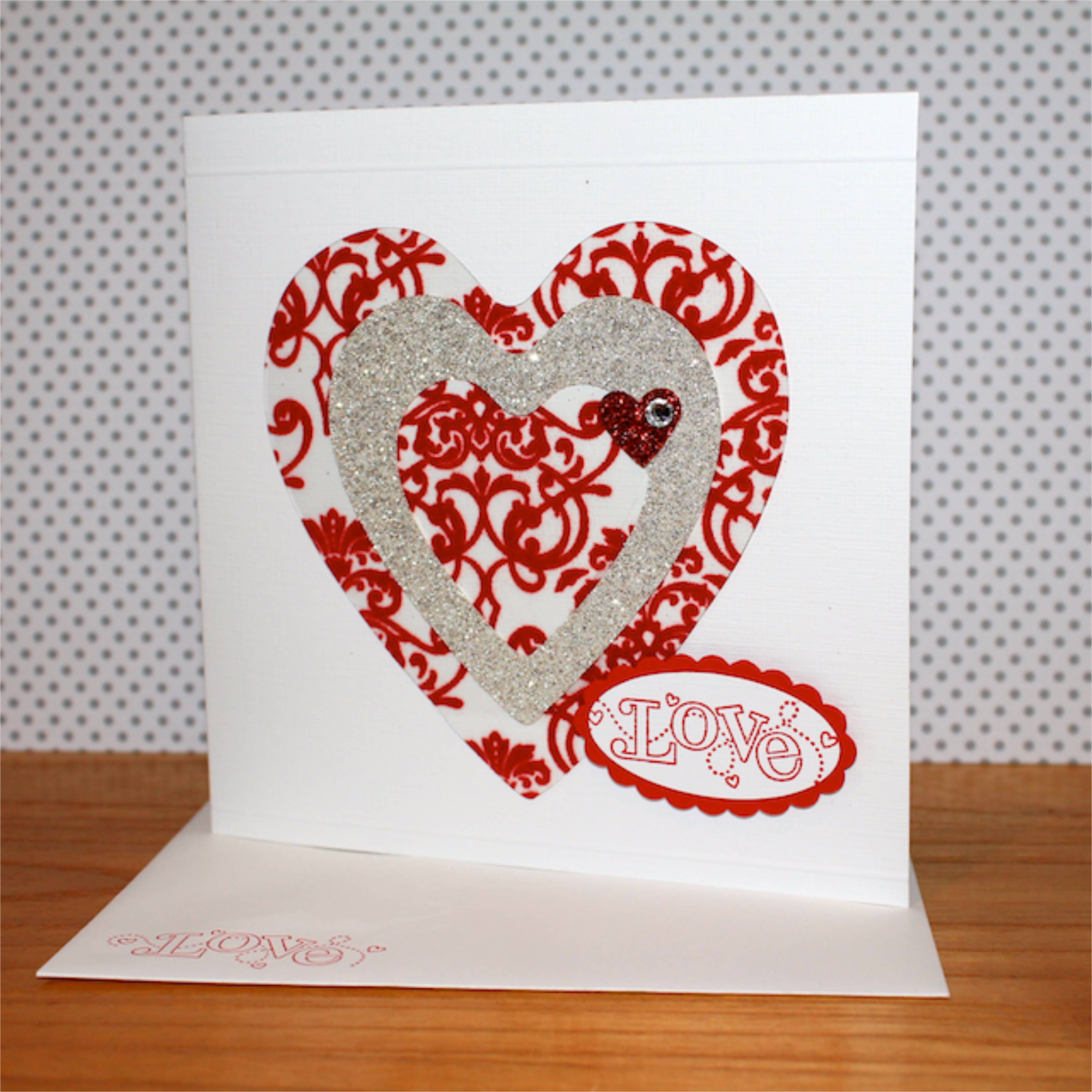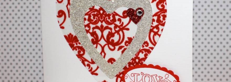 You could create this look with any nesting framelits or cutters, and I’ve used a combo of Silver Glimmer Paper and Flocked Window Sheet from Stampin’ Up! to add some serious shine! The sentiment is from last year’s saleabration set with the accompanying “be mine” stamped inside the card.