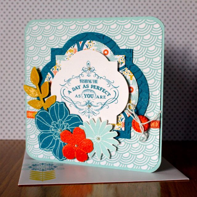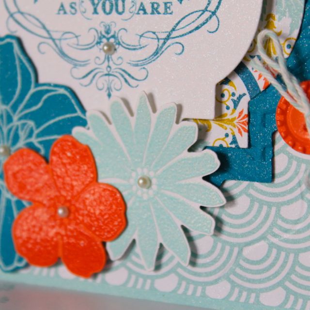 The Secret Garden Bundle is one of my new favourite product sets from the Catty and here I have stamped in versamark and clear embossed on to Summer Starfruit card stock for the leaves and Tangerine Tango card stock for the small flower. For the other two I have stamped in versamark and embossed with the new Pool Party embossing powder – onto Island Indigo card stock for the larger flower and whisper white cardstock for the medium flower. I love the delicious shine this creates…