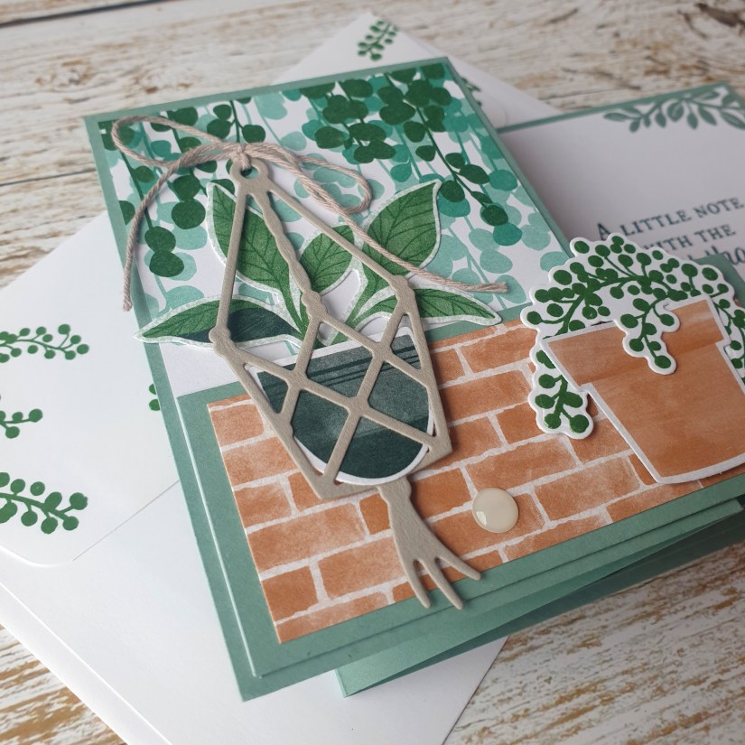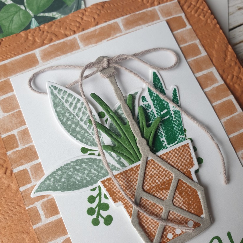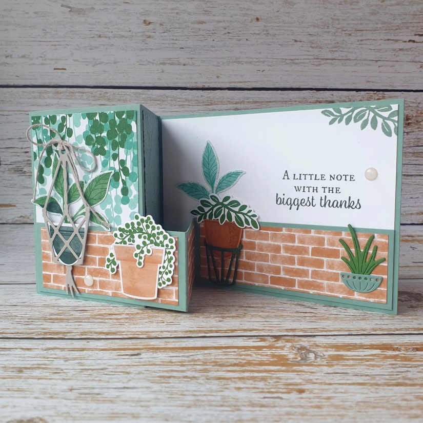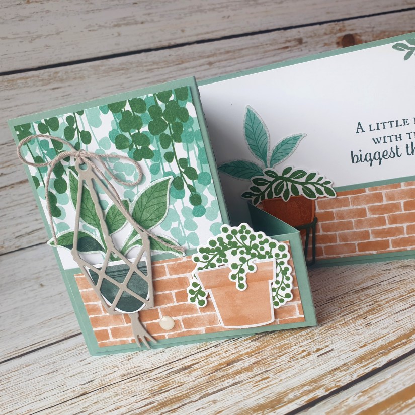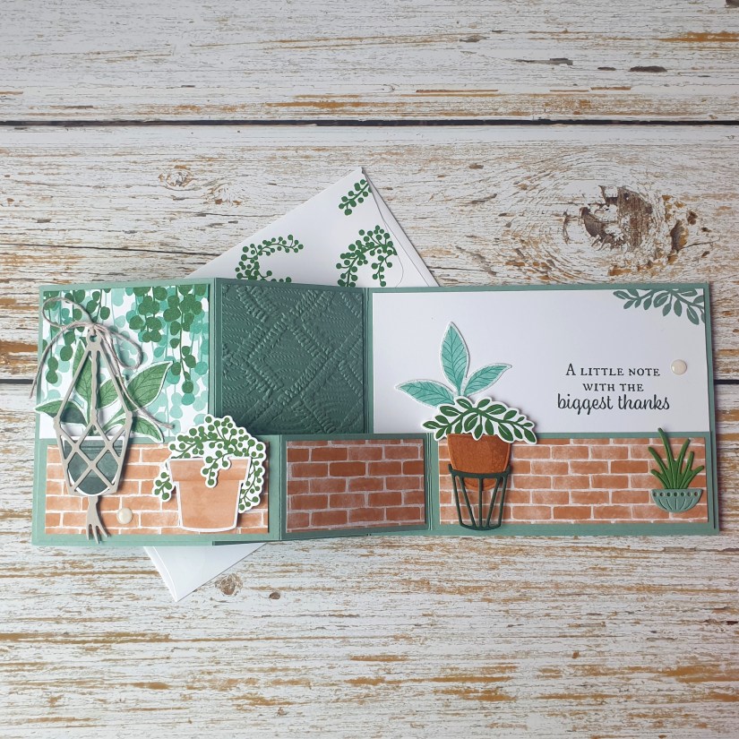 My first card is a Double Z Fold, using the red brick design from the DSP pack as a “wall” for my plant pots. You can shop all of the products I used for this card by visiting the project page here and selecting which items to add to your cart.