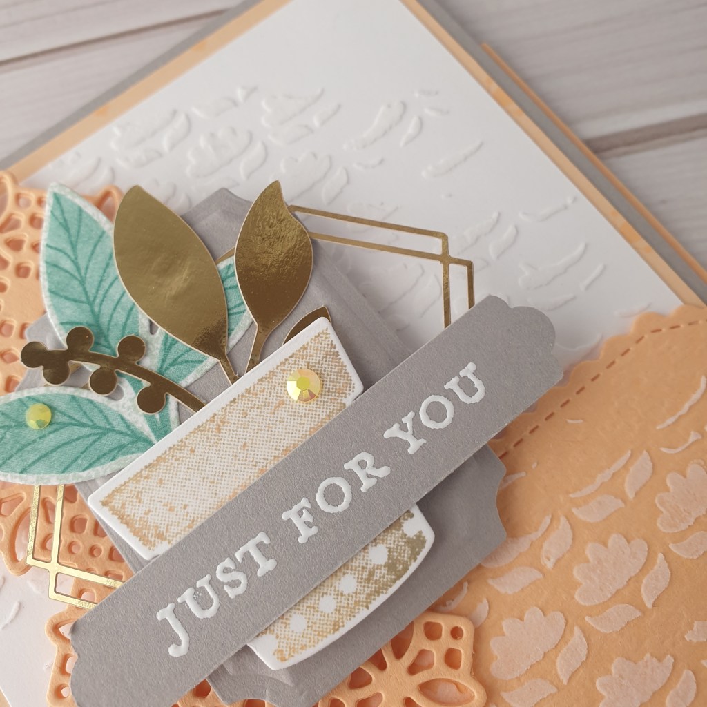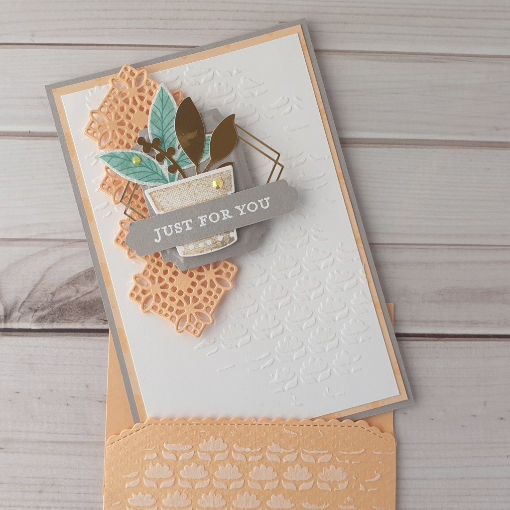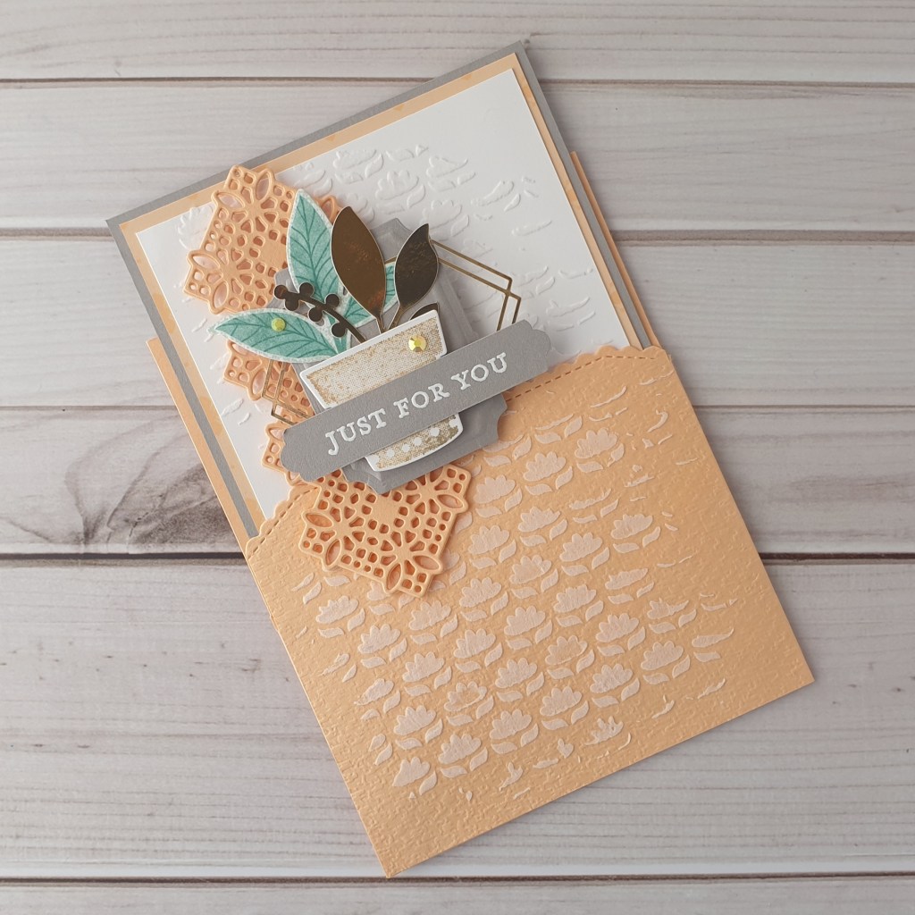 The large decorative diecut is from the Fabulous Florals Dies, and I’ve glued three together,making it nice and sturdy. By adding dimensionals to just the top of the diecut, it leaves the bottom section free to slide over the pocket, as the card is inserted.