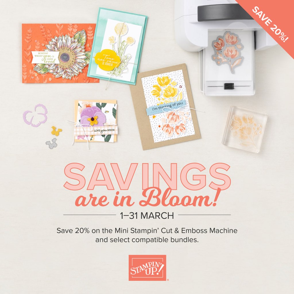 There is so much to love about the Mini Stampin’ Cut and Emboss Machine – it’s portable, lightweight, and built to last. This Mini (and mighty) Stampin’ Cut & Emboss Machine can be used by crafters of any capability—it makes it easy to take your crafting to the next level! Available at 20% off for the month of March, this is unbeatable value, along with a selection of bundles, perfectly sized to be used in the Mini.